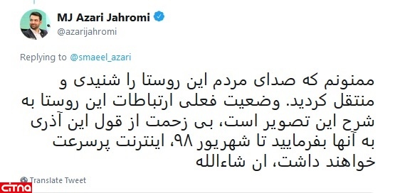 آذری جهرمی وزیر ارتباطات و فناوری اطلاعات هم در پاسخ به این توئیت نوشت: ممنونم که صدای مردم این روستا را شنیدی و منتقل کردید. بی زحمت از قول این آذری به آن ها بفرمایید تا شهریور ۹۸ اینترنت پرسرعت خواهند داشت.