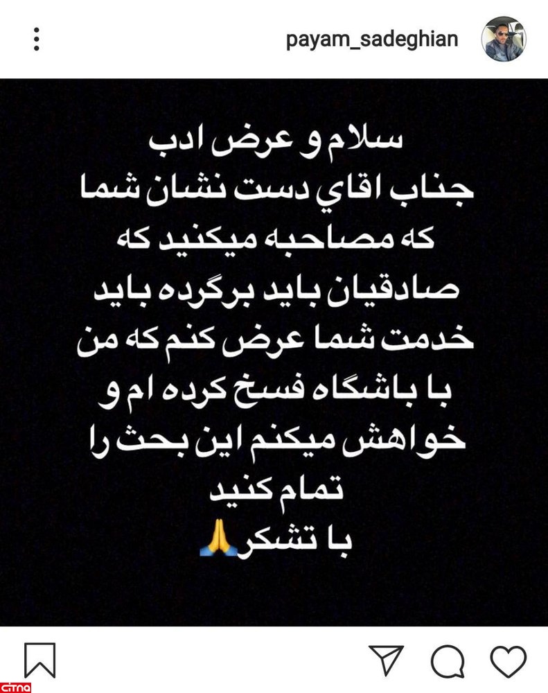 پس از این حرف ها بود که صادقیان پستی را در اینستاگرامش منتشر کرد. او شایعه بازگشتش به سپیدرود را رد کرد.