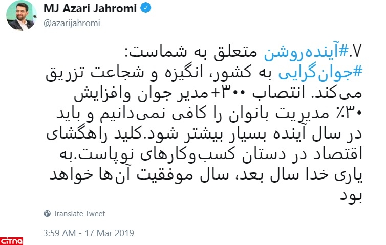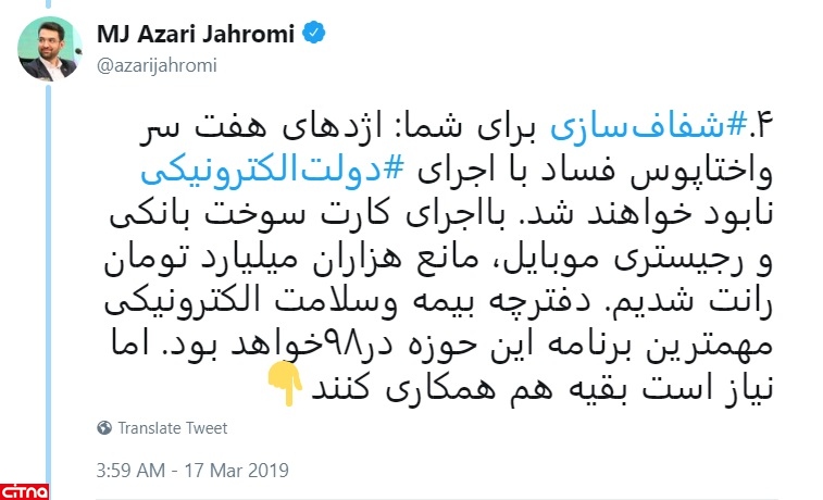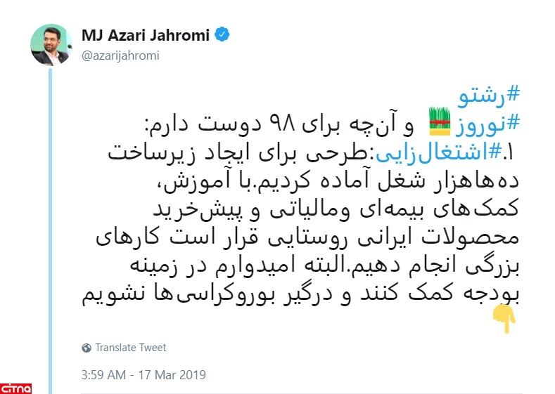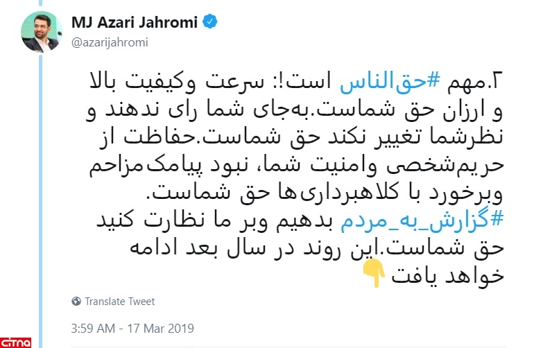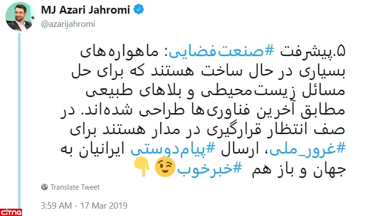 به گزارش سیتنا در رشته توئیت های مهندس آذری جهرمی آمده است: