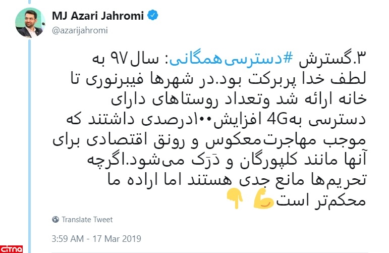 ۳.گسترش #دسترسیهمگانی: سال۹۷ به لطف خدا پربرکت بود.در شهرها فیبرنوری تا خانه ارائه شد وتعداد روستاهای دارای دسترسی به4G افزایش۱۰۰درصدی داشتند که موجب مهاجرتمعکوس و رونق اقتصادی برای آنها مانند کلپورگان و دَرَک میشود.اگرچه تحریمها مانع جدی هستند اما اراده ما محکمتر است.