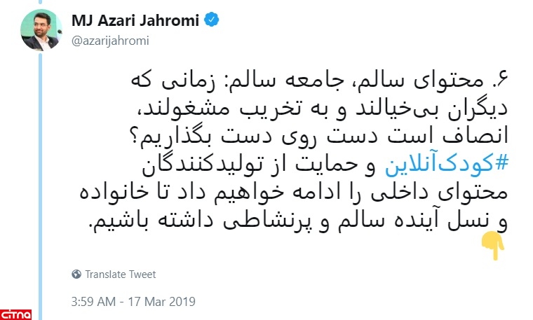 ۶. محتوای سالم، جامعه سالم: زمانی که دیگران بیخیالند و به تخریب مشغولند، انصاف است دست روی دست بگذاریم؟ #کودکآنلاین و حمایت از تولیدکنندگان محتوای داخلی را ادامه خواهیم داد تا خانواده و نسل آینده سالم و پرنشاطی داشته باشیم.