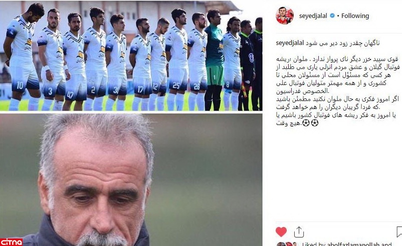 سیدجلال حسینی کاپیتان پرسپولیس در اینستاگرام از شرایط بد تیم ملوان بندرانزلی نوشت.
