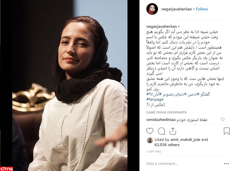 به گزارش سرویس وبگردی سیتنا، نگار جواهریان با انتشار تصویری از خود در اینستاگرام درباره بازیگری اینچنین نوشت:
