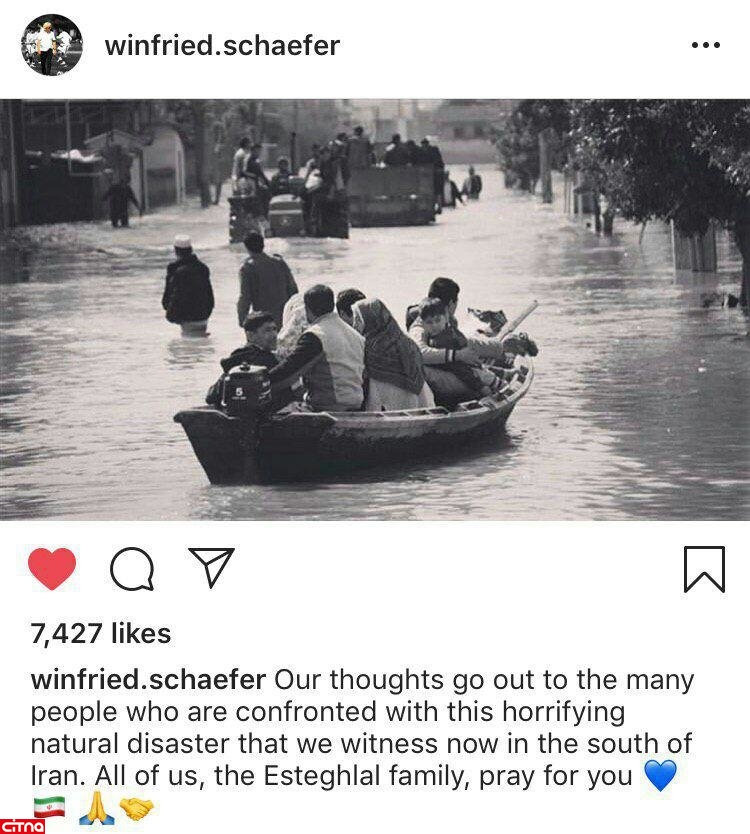 به گزارش سرویس وبگردی سیتنا، وینفرد شفر سرمربی آلمانی استقلال برای همدردی با مردم سیل زده استان های کشور پیام زیر را در صفحه اینستاگرامش منتشر کرد و نوشت: