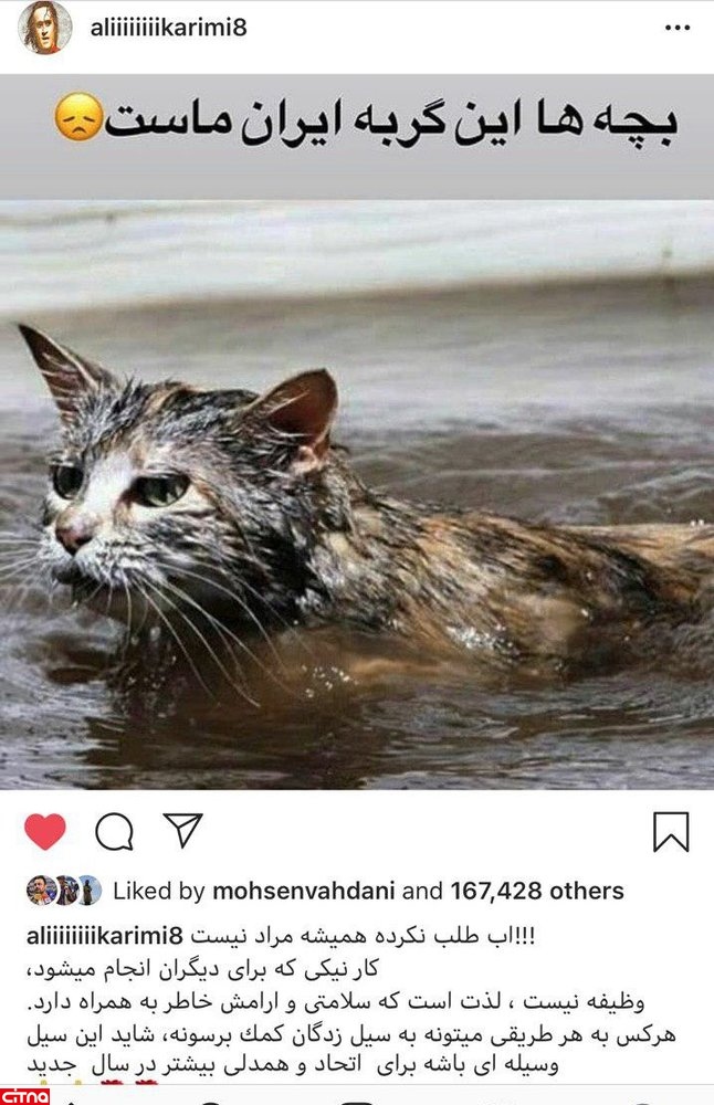 به گزارش سرویس وبگردی سیتنا، علی کریمی اسطوره فوتبال ایران با انتشار پستی در صفحه اینستاگرامش نسبت به سیل شدیدی که در کشور جاری شده و جان تعدادی از هموطنان را گرفته واکنش نشان داد.