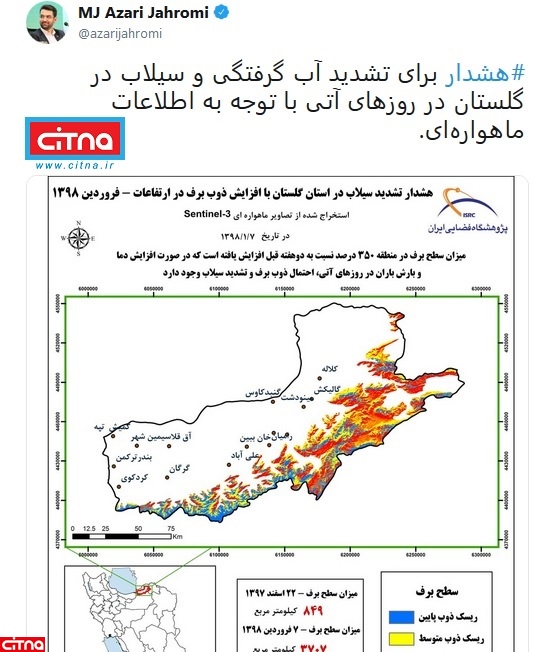 وزیر ارتباطات و فناوری اطلاعات، اعلام کرد: هشدار برای تشدید آب گرفتگی و سیلاب در گلستان در روزهای آتی با توجه به اطلاعات ماهوارهای.