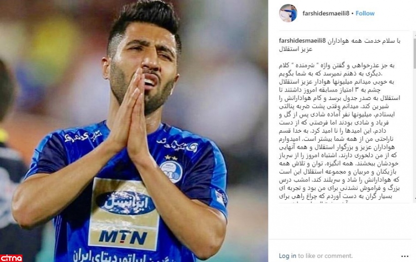 «با سلام خدمت همه هواداران عزیز استقلال. به جز عذرخواهی و گفتن واژه “ شرمنده “ کلام دیگری به ذهنم نمیرسد که به شما بگویم.