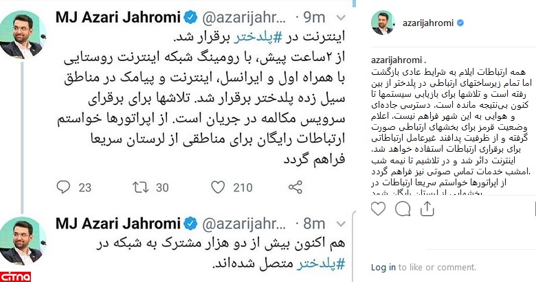 وزیر ارتباطات و فناوری اطلاعات، اعلام کرد: همه ارتباطات ایلام به شرایط عادی بازگشت اما تمام زیرساختهای ارتباطی در پلدختر از بین رفته است و تلاشها برای بازیابی سیستمها تا کنون بینتیجه مانده است.