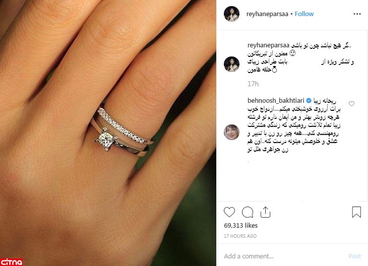 به گزارش سرویس وبگردی سیتنا، ریحانه پارسا، بازیگر جوانی که با سریال «پدر» شناخته شد، عکسی از حلقه نامزدی خود را به همراه متنی کوتاه در اینستاگرام منتشر کرد. بهنوش بختیاری هم در زیر این پست نوشت: