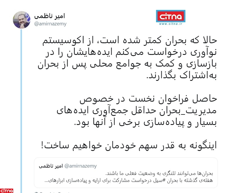 حالا که بحران کمتر شده است، از اکوسیستم نوآوری درخواست میکنم ایدههایشان را در بازسازی و کمک به جوامع محلی پس از بحران بهاشتراک بگذارند.