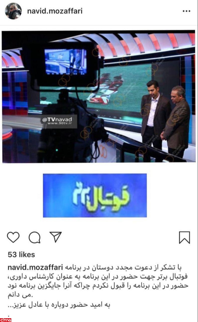 در همین ارتباط نوید مظفری که یکی از کارشناسان داوری برنامه نود بود در حمایت از عادل فردوسی پور، درخواست برنامه فوتبال برتر را رد کرد و در اینستاگرام خود نوشت: