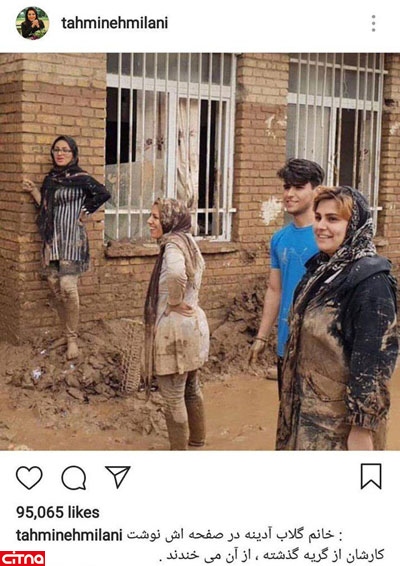تصویری که تهمینه میلانی به صورت ناقص و سانسور شده منتشر کرده است، تعدادی از سیل زدگان را با لباسهای گلی در حالتی خندان نشان میدهد. در این تصویری یکی از نیروهای مردمی (بسیجی) که برای امداد حضور دارد سانسور شده است. این تصویر پس از اعتراضهای فراوان از صفحه تهمینه میلانی حذف شد. اما نکته ماجرا اینجا بود که تهمینه میلانی در توضیح این عکس جنجالی نوشته بود "خانم گلاب آدینه در صفحه اش نوشت: کارشان از گریه گذشته، از آن میخندند."