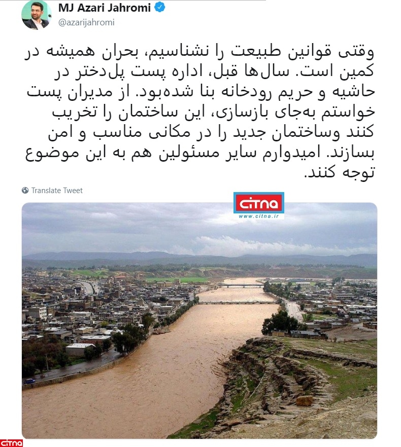 وقتی قوانین طبیعت را نشناسیم، بحران همیشه در کمین است. سالها قبل، اداره پست پلدختر در حاشیه و حریم رودخانه بنا شده بود. از مدیران پست خواستم به جای بازسازی، این ساختمان را تخریب کنند و ساختمان جدید را در مکانی مناسب و امن بسازند. امیدوارم سایر مسئولین هم به این موضوع توجه کنند.