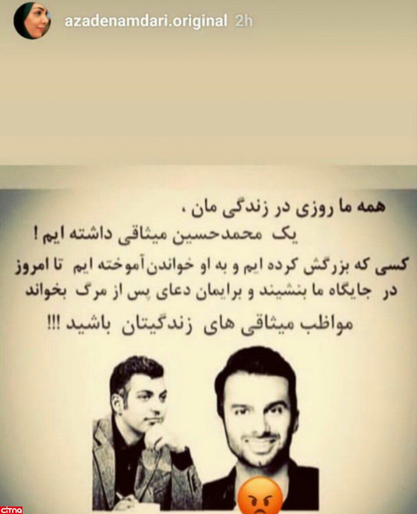 نامداری در تازهترین استوری خود، با انتشار عکسی از این دو و نشاندن استیکر عصبانیت، در کنار عکس میثاقی نوشت: