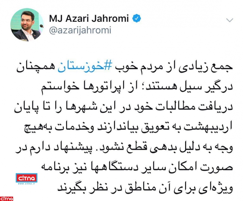 جمع زیادی از مردم خوب #خوزستان همچنان درگیر سیل هستند؛ از اپراتورها خواستم دریافت مطالبات خود در این شهرها را تا پایان اردیبهشت به تعویق بیاندازند و خدمات به هیچ وجه به دلیل بدهی قطع نشود. پیشنهاد دارم در صورت امکان سایر دستگاهها نیز برنامه ویژهای برای آن مناطق در نظر بگیرند.