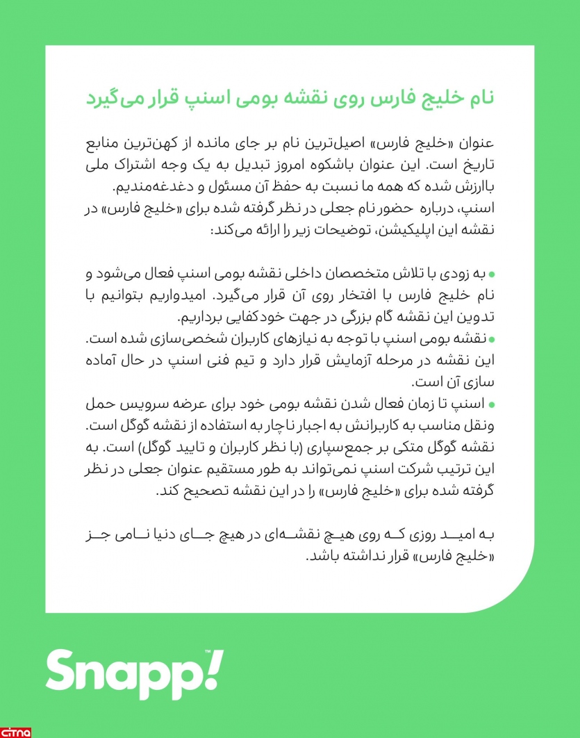 یکی از مدیران اسنپ اعلام کرد: نقشه بومی توسعه داده شده توسط تیم فنی اسنپ که هم اکنون در مرحله آزمایش قرار داد به زودی جایگزین نقشه گوگل خواهد شد و نام خلیج همیشه فارس ما با افتخار روی آن قرار خواهد گرفت.