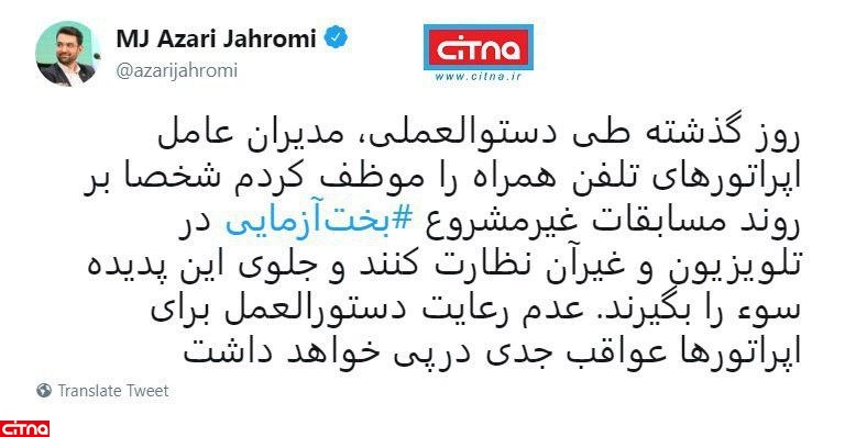 روز گذشته طی دستوالعملی، مدیران عامل اپراتورهای تلفن همراه را موظف کردم شخصا بر روند مسابقات غیرمشروع #بختآزمایی در تلویزیون و غیرآن نظارت کنند و جلوی این پدیده سوء را بگیرند. عدم رعایت دستورالعمل برای اپراتورها عواقب جدی درپی خواهد داشت.