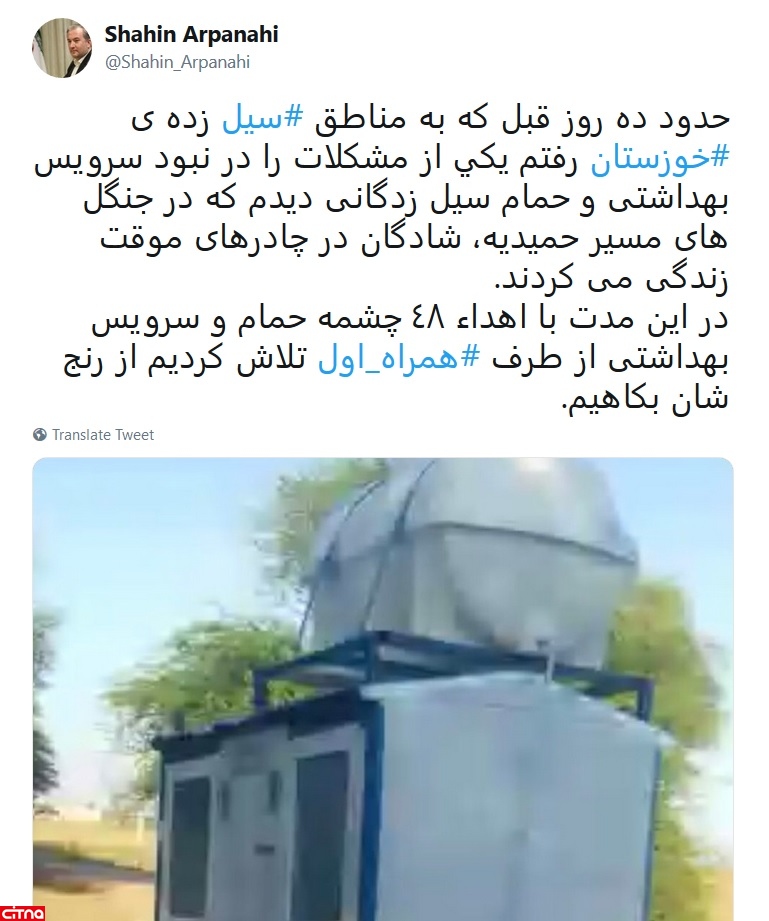 حدود ده روز قبل که به مناطق #سیل زده ى #خوزستان رفتم یکی از مشکلات را در نبود سرویس بهداشتى و حمام سیل زدگانى دیدم که در جنگل هاى مسیر حمیدیه، شادگان در چادرهاى موقت زندگى مى کردند. در این مدت با اهداء ۴٨ چشمه حمام و سرویس بهداشتى از طرف #همراه_اول تلاش کردیم از رنج شان بکاهیم.