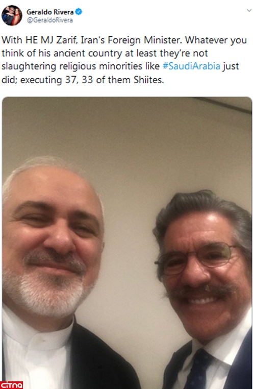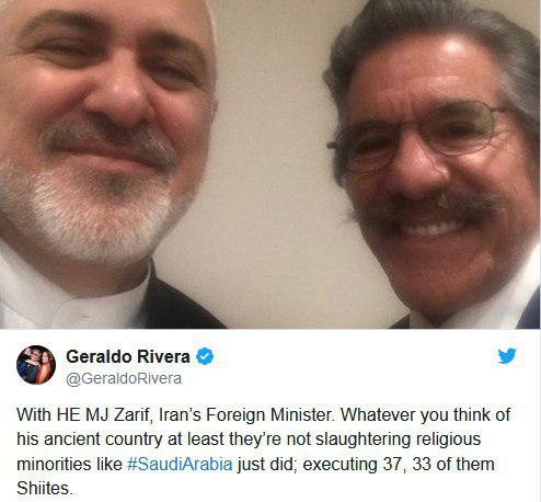 مجری شبکه فاکس نیوز با انتشار یک سلفی از خود و ظریف، توئیت کرد: مهم نیست که درباره کشور باستانی او چه فکر میکنید، حداقل اینکه آنها مانند عربستان، اقلیتهای دینی را سلاخی نمیکنند. ۳۳ نفر از ۳۷ اعدامی در عربستان، شیعه بودند.