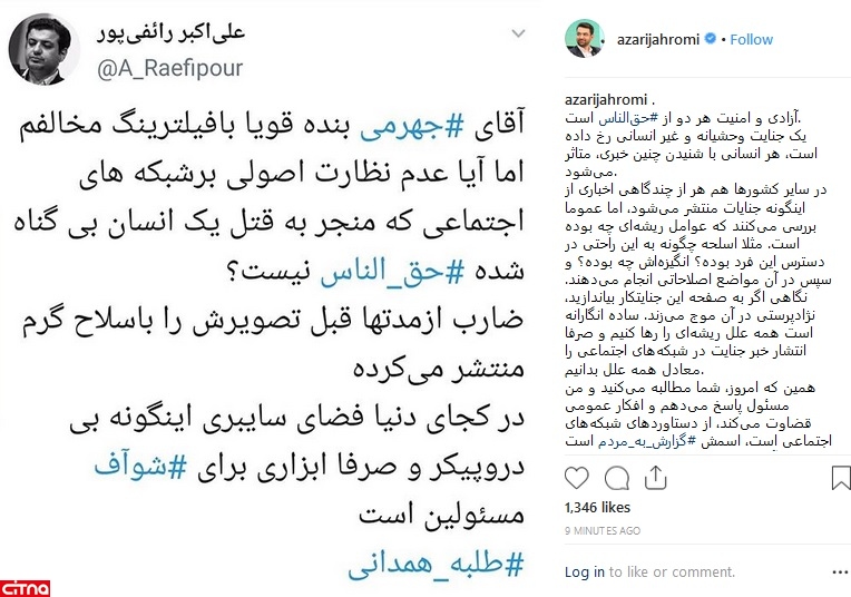 معاون وزیر ارتباطات با طعنه به شبکههای اجتماعی غربی با الگوی استاندارد آمریکایی، گفت: صفحات پاسدارانی که با تروریسم مبارزه میکنند را پاک میکنید، اما صفحه تروریستی که مردم را به قتل تهدید میکند، نه!