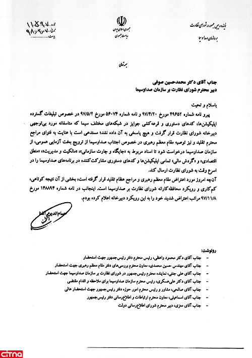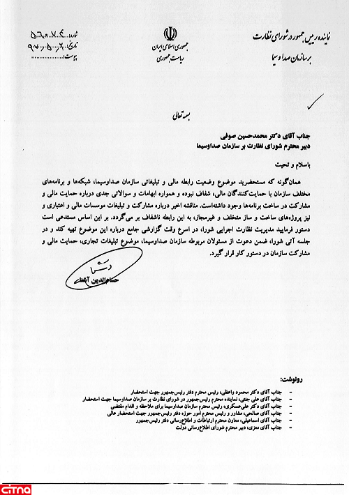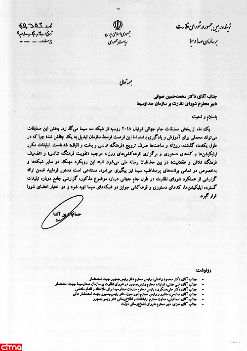 تصویر مکاتبات نماینده قوه مجریه در شورای نظارت با دبیرخانه شورا و سازمان صداوسیما با هدف نظارت همگانی، حکمرانی مشارکتی و ارتقای شفافیت منتشر میشود.»