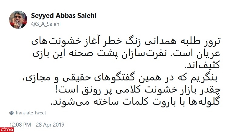 به گزارش سیتنا، سیدعباس صالحی، وزیر فرهنگ و ارشاد اسلامی، توئیت کرد: