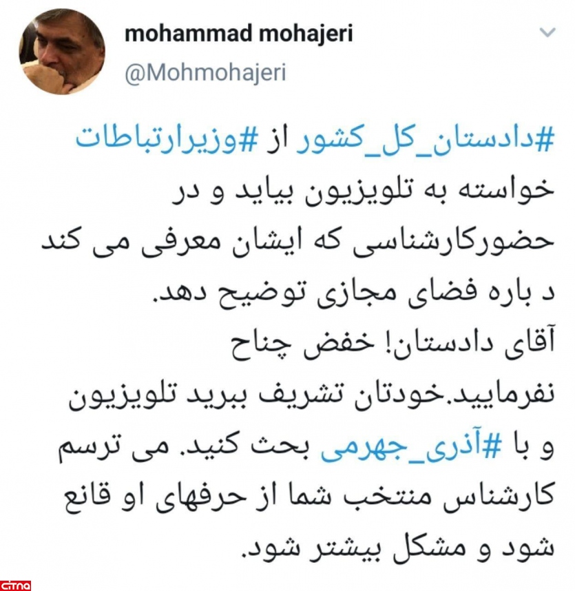 #دادستان_کل_کشور از #وزیرارتباطات خواسته به تلویزیون بیاید و در حضور کارشناسی که ایشان معرفی می کند در باره فضای مجازی توضیح دهد. آقای دادستان! خفض جناح نفرمایید.خودتان تشریف ببرید تلویزیون و با #آذری_جهرمی بحث کنید.می ترسم کارشناس منتخب شما از حرفهای او قانع شود و مشکل بیشتر شود!