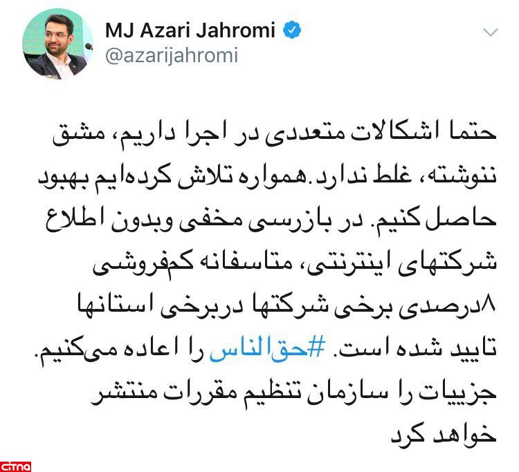 حتما اشکالات متعددی در اجرا داریم، مشق ننوشته، غلط ندارد. همواره تلاش کردهایم بهبود حاصل کنیم. در بازرسی مخفی وبدون اطلاع شرکتهای اینترنتی، متاسفانه کمفروشی ۸درصدی برخی شرکتها دربرخی استانها تایید شده است. #حقالناس را اعاده میکنیم. جزییات را سازمان تنظیم مقررات منتشر خواهد کرد.