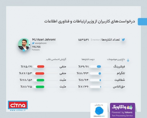 به گزارش سیتنا، کاربران #توییتر_فارسی از وزیر ارتباطات چه درخواستهایی داشتهاند؟ وزیر ارتباطات در سال ۹۷ بیشتر از ۱۵۳ هزار بار در توییتر منشن شده است. بخش زیادی از منشنهای کاربران به محمدجواد آذری جهرمی، پیرامون ۴ موضوع #فیلترینگ، #تلگرام، #شفافیت و #حقالناس بودهاند.محمدجواد آذری جهرمی بهدنبال پست گذاشتن در توئیتر، به برخی از کاربران نیز پاسخ توئیتری میدهد و این چرخه باعث شده است تا کاربران وزیر ارتباطات را منشن(اشاره) کرده و برخی درخواستهای خود را از طریق این شبکه اجتماعی فیلتر شده دنبال کنند.