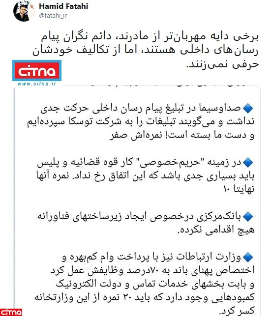 به گزارش سیتنا، مهندس حمید فتاحی با اشاره سخنان مدیر یکی از پیام رسانهای داخلی، توئیت کرد: