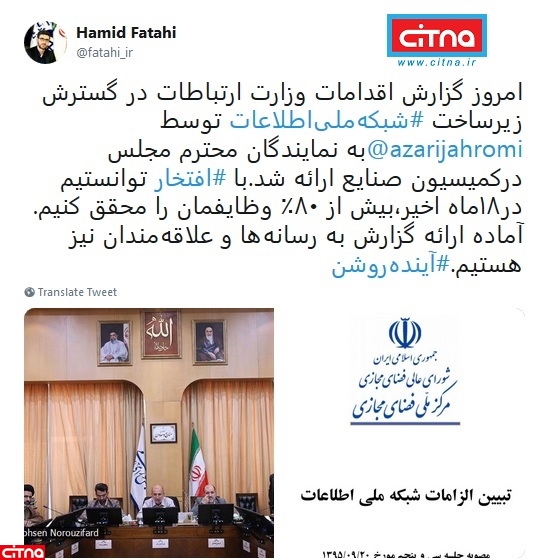 امروز گزارش اقدامات وزارت ارتباطات در گسترش زیرساخت #شبکهملیاطلاعات توسط مهندس آذری جهرمی به نمایندگان محترم مجلس در کمیسیون صنایع ارائه شد. با #افتخار توانستیم در ۱۸ماه اخیر، بیش از ۸۰٪ وظایفمان را محقق کنیم. آماده ارائه گزارش به رسانهها و علاقهمندان نیز هستیم.#آیندهروشن