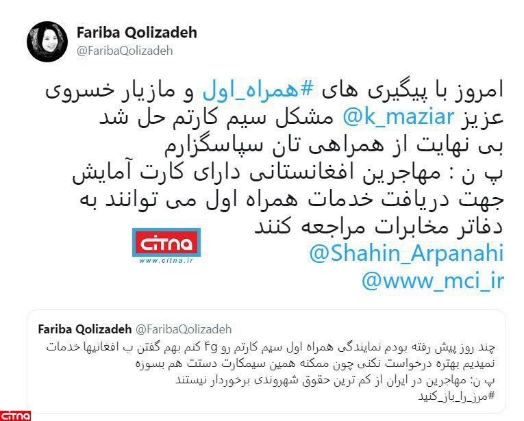 به گزارش سیتنا، فریبا قلی زاده، مهاجر افغانستانی مقیم ایران که با مشکل عدم سرویس دهی ارتباطی در یکی از دفاتر پیشخوان مواجه شده و در توئیتی از شاهین آرپناهی، مدیرکل ارتباطات همراه اول درخواست پیگیری کرده بود (لینک)، نهایتا امروز توئیت کرد: