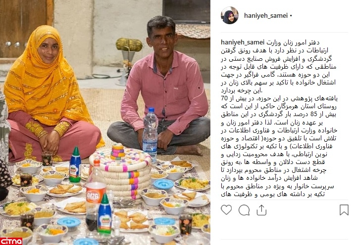 یافتههای پژوهشی در این حوزه، در بیش از 70 روستای استان هرمزگان حاکی از این است که بیش از 85 درصد بار گردشگری در این مناطق بر عهده زنان است؛ لذا دفتر امور زنان و خانواده وزارت ارتباطات و فناوری اطلاعات در تلاش است با تلفیق دو حوزه اقتصاد و فناوری اطلاعات و با تکیه بر تکنولوژی های نوین ارتباطی، با هدف محرومیت زدایی و قطع دست دلالان و واسطه ها، به رونق چرخه اشتغال در مناطق محروم بپردازد تا شاهد افزایش درآمد خانواده ها و زنان سرپرست خانوار به ویژه در مناطق محروم با تکیه بر داشته های بومی و ظرفیت های فردی باشیم.