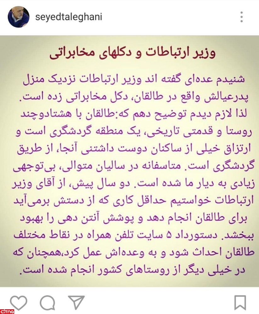 در پی هجمهی اخیر دلواپسان به وزیر ارتباطات برای احداث دکل تلفن همراه در نزدیکی منزل پدر همسرش در یکی از روستاهای طالقان، سیدمهدی طالقانی در پستی اینستاگرامی پیرامون این اقدام توضیح داد.
