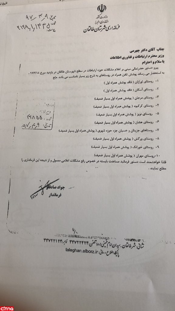 در ۹ تیر ۹۷، فرماندار طالقان درخواست کرد که به ۱۰روستای آنجا دسترسی داده شود (اتفاقا پوشش روستای پدرخانم وزیر پس از یک سال وزارتش بسیار ضعیف!) و مثل سایر مناطق با آن برخورد شد. اتفاقا شنبه در روز جهانی ارتباطات، جشن دسترسی۷۰۰۰ روستا در سراسر کشور را خواهیم داشت، یعنی۷۰۰۰ وزیر داریم؟