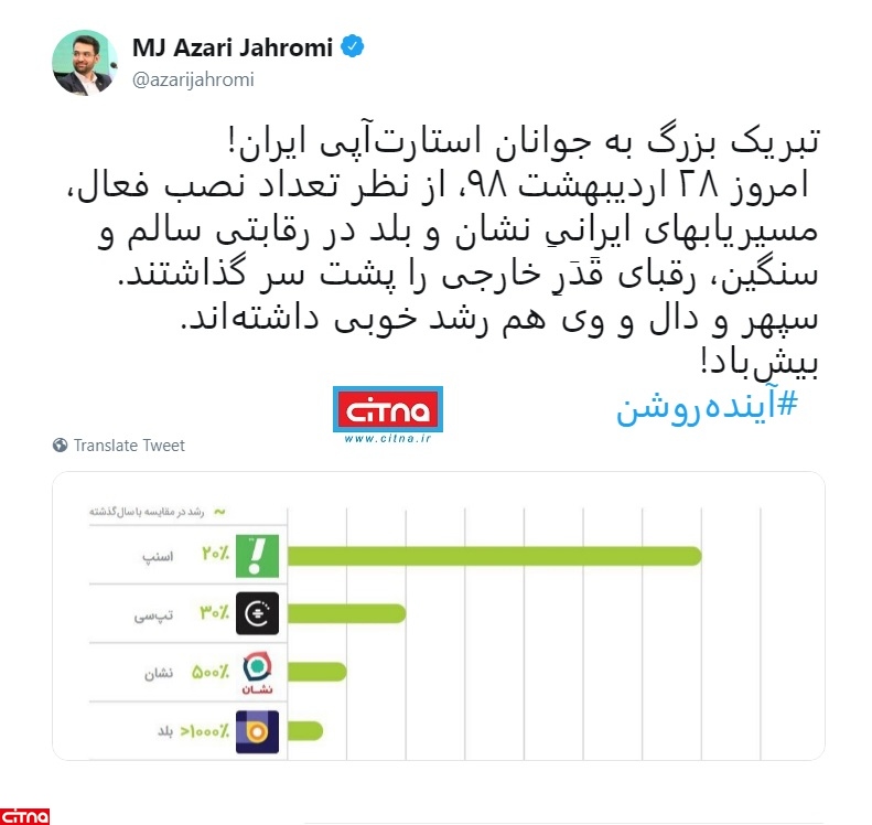 آذری جهرمی: تبریک بزرگ به جوانان استارتآپی ایران!/ امروز ۲۸ اردیبهشت ۹۸، از نظر تعداد نصب فعال، مسیریابهای ایرانیِ نشان و بلد در رقابتی سالم و سنگین، رقبای خارجی را پشت سر گذاشتند/ سپهر و دال و وی هم رشد خوبی داشتهاند بیشباد!