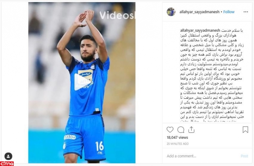 ولی تو این مدت خیلی بی احترامی به من و خانوادم شد ولی من به دل نمیگیرم چون عاشق استقلالم ولی با کسایی که بی احترامی کردن کاری ندارم چون یگانه قاضی فقط خداست، ولی شما هوادار های واقعی استقلال به خودم میبالم که ۱فصل سرباز شما هواداران واقعی و باشگاه بزرگ استقلال بودم واقعا خوشحالم که همچین چیزی نصیب من شد قول میدهم نماینده شایسته ای برای شما هوادارای واقعی استقلال و باشگاه بزرگ استقلال باشم به امید دیدار شما خوبان در ورزشگاه ازادی من خودمو پسر تاج میدونم"