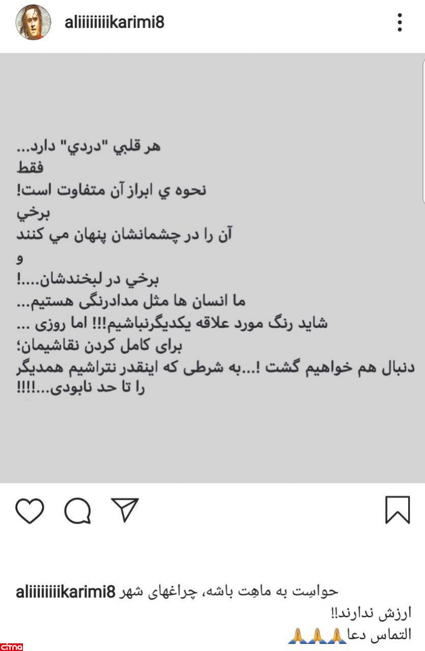 کریمی در قسمت کپشن این پست نیز جمله جالبی را منتشر کرد: حواسِت به ماهِت باشه، چراغهاى شهر ارزش ندارند؟! التماس دعا