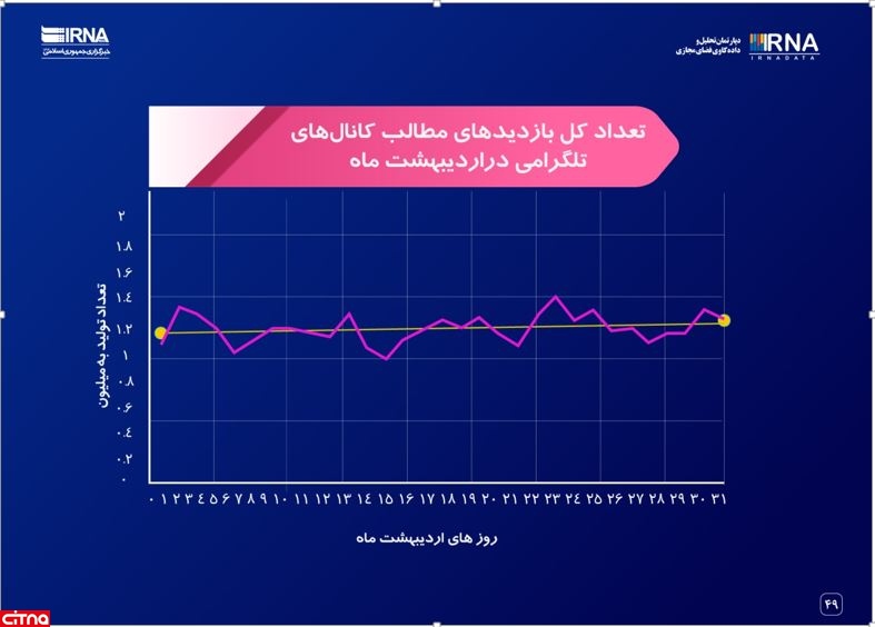 این آمار در مقایسه با بازدیدهای اسفندماه نیز افت ۶۵ میلیون بازدید در هر روز را نشان میدهد. این در حالی است که میزان تولیدات کانالهای تلگرامی در اردیبهشتماه در مقایسه با فروردین، ۱۱۳ میلیون بار در هر روز افزایش داشته است.