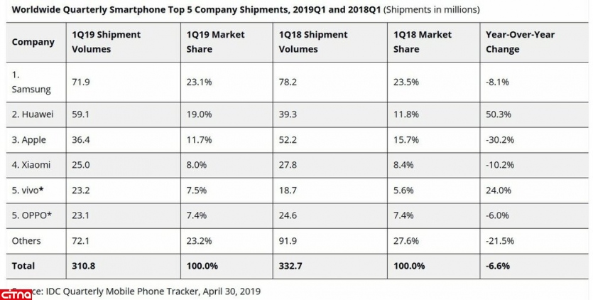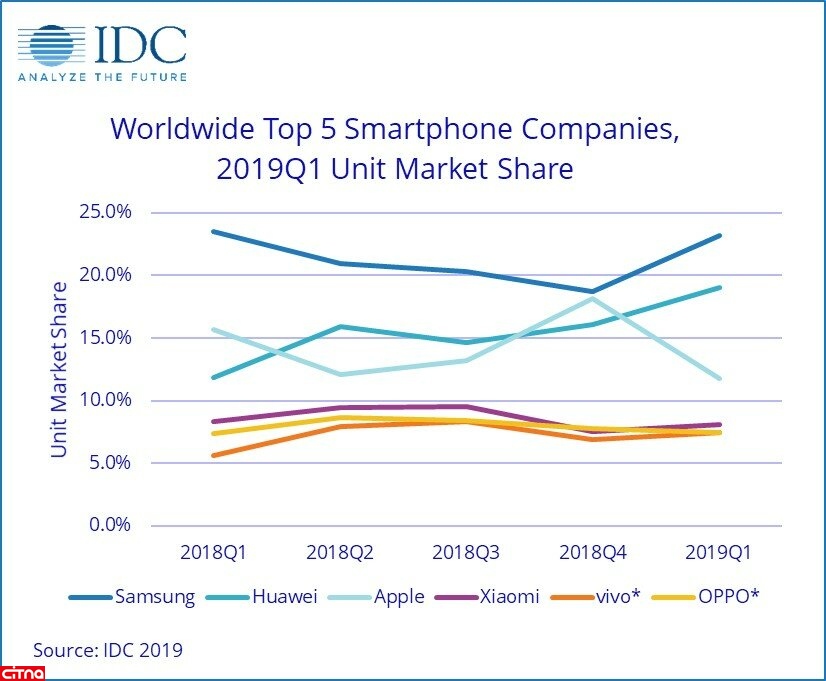 سامسونگ با وجود کاهش ۸.۱ درصدی موبایلهایش در سه ماهه نخست ۲۰۱۹ میلادی، ۷۱.۹ میلیون دستگاه بارگیری کرد و با در اختیار داشتن ۲۳.۱ درصد از سهم بازار همچنان پیشتار است.
