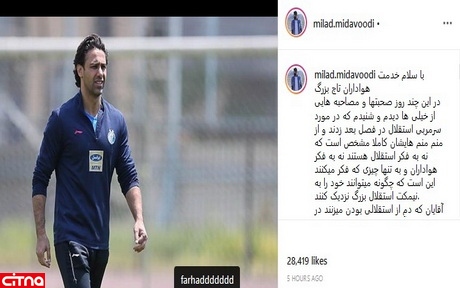 به گزارش سرویس وبگردی سیتنا، میلاد میداودی با انتشار پستی در صفحه اینستاگرامش از سپردن سکان هدایت استقلال به فرهاد مجیدی حمایت کرد و نوشت:
