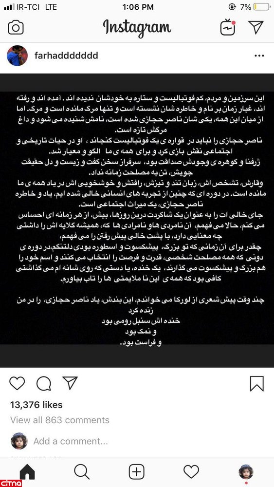 اعضای کمیته فنی که عمدتا از پیشکسوتان استقلال هستند، در کنار مدیران این تیم با سرمربیگری فرهاد مجیدی مخالفت می کنند زیرا معتقدند او تجربه کافی برای این کار را ندارد و همین موضوع باعث شده تا فرهاد با انتشار متنی در صفحه اینستاگرامش ضمن تمجید از شخصیت ناصر حجازی،به مخالفان خود هم طعنه بزند.