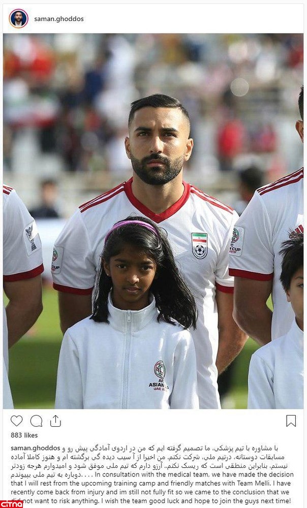 در این بین نام سامان قدوس در میان دعوت شدگان به تیم ملی دیده نمی شود. ستاره آمیان فرانسه نسبت به این موضوع واکنش نشان داد و مصدومیتش را عامل دعوت نشدنش دانست.