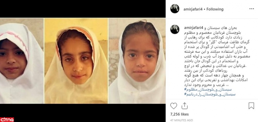 اینستاپست امیر جعفری برای جانباختن ۳ کودک در سیستان و بلوچستان