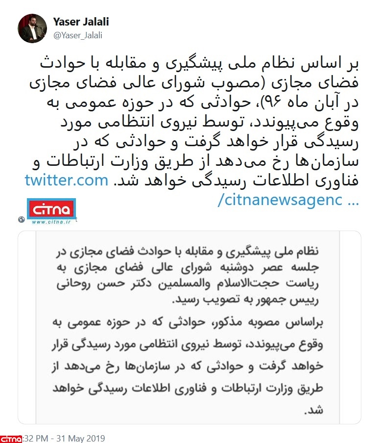 گفتنی است؛ بر اساس مصوبه مذکور آن دسته از حوادث فضای مجازی که در حوزه مردم، کسب و کارهای خصوصی و موسسات غیردولتی و غیر زیرساختی به وقوع میپیوندد توسط نیروی انتظامی جمهوری اسلامی، آن دسته از حوادث فضای مجازی که در حوزه دستگاه های غیر زیرساختی رخ میدهد از طریق وزارت ارتباطات و فناوری اطلاعات و آن دسته از حوادثی که در حوزه دستگاههای زیرساختی اتفاق می افتد توسط مرکز مدیریت راهبردی افتا مورد رسیدگی قرار خواهد گرفت.