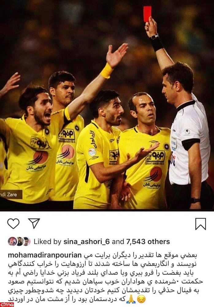 علی رغم سکوت بازیکنان پرسپولیس درباره این حواشی، سپاهانیها ترجیح میدهند همچنان درباره این مسابقه پرحاشیه صحبت کنند. محمد ایرانپوریان، بازیکن باشگاه سپاهان درباره حواشی این مسابقه در صفحه اینستاگرام خود نوشت: