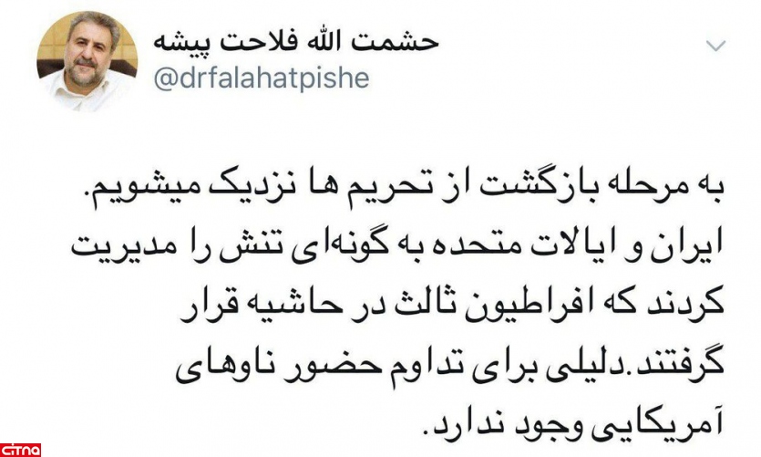 روایت توئیتری فلاحتپیشه دربارهی عبور ایران و آمریکا از تنش و برچیده شدن تحریمها