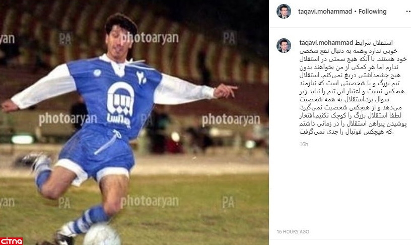 به گزارش سرویس وبگردی سیتنا، مدیران استقلال همچنان درگیر مذاکره با گزینه سرمربیگری این تیم هستند و هنوز مشخص نیست چه کسی برای فصل آینده روی نیمکت آبی می نشیند. در همین راستا محمد تقوی پیشکسوت استقلال و سرمربی سابق تراکتورسازی در اینستاگرام خود نوشت: