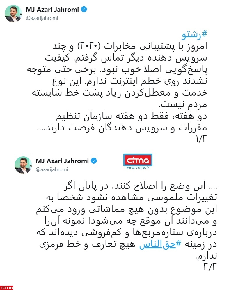 وزیر ارتباطات و فناوری اطلاعات، گفت: امروز با پشتیبانی مخابرات (۲۰۲۰) و چند سرویس دهنده دیگر تماس گرفتم. کیفیت پاسخگویی اصلا خوب نبود. برخی حتی متوجه نشدند روی خطم اینترنت ندارم. این نوع خدمت و معطلکردن زیاد پشت خط شایسته مردم نیست.