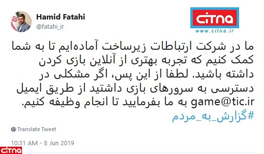 ما در شرکت ارتباطات زیرساخت آمادهایم تا به شما کمک کنیم که تجربه بهتری از آنلاین بازی کردن داشته باشید. لطفا از این پس، اگر مشکلی در دسترسی به سرورهای بازی داشتید از طریق ایمیل game@tic.ir به ما بفرمایید تا انجام وظیفه کنیم.